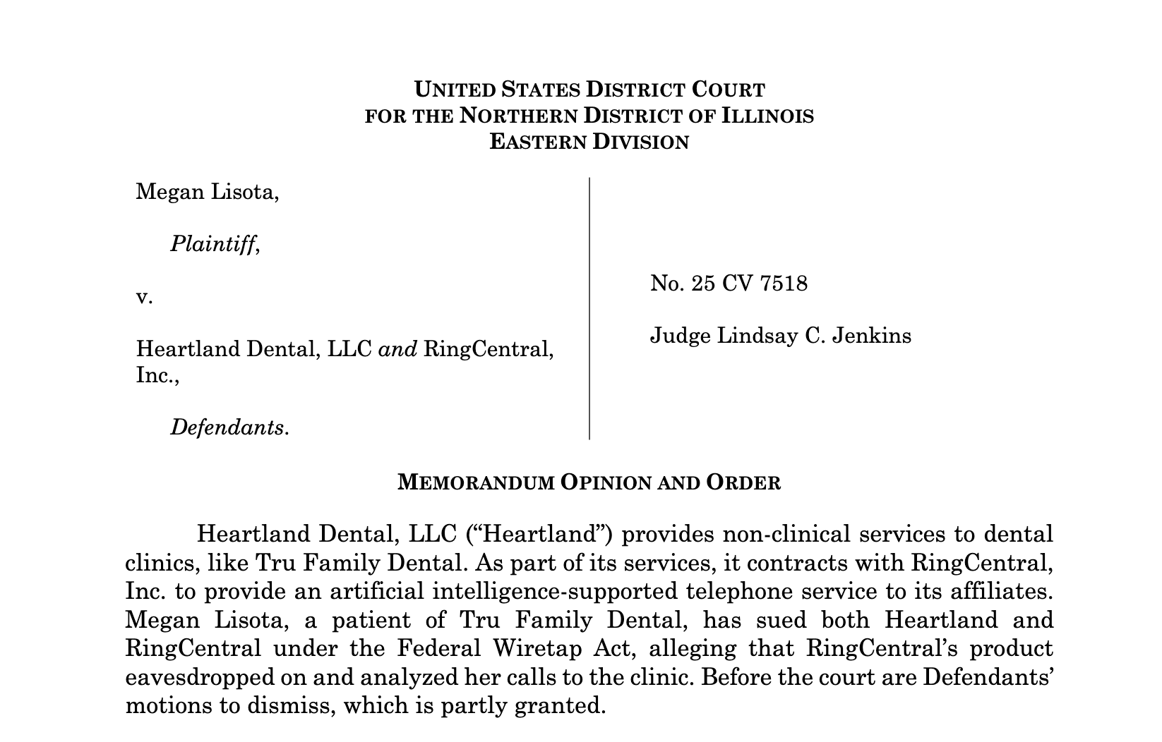 本案于2025年7月3日提起,被告为Heartland Dental与云端通信服务商RingCentral。原告Megan Lisota主张,其牙医诊所委托Heartland Dental处理来电行政事务,后者再委托RingCentral提供云端电话服务,该服务集成了AI实时语音转录、通话自动摘要及情绪分析功能。原告称,其通话内容在未获明确告知、亦未同意的情况下被处理,违反ECPA关于禁止截取电子通信的规定。