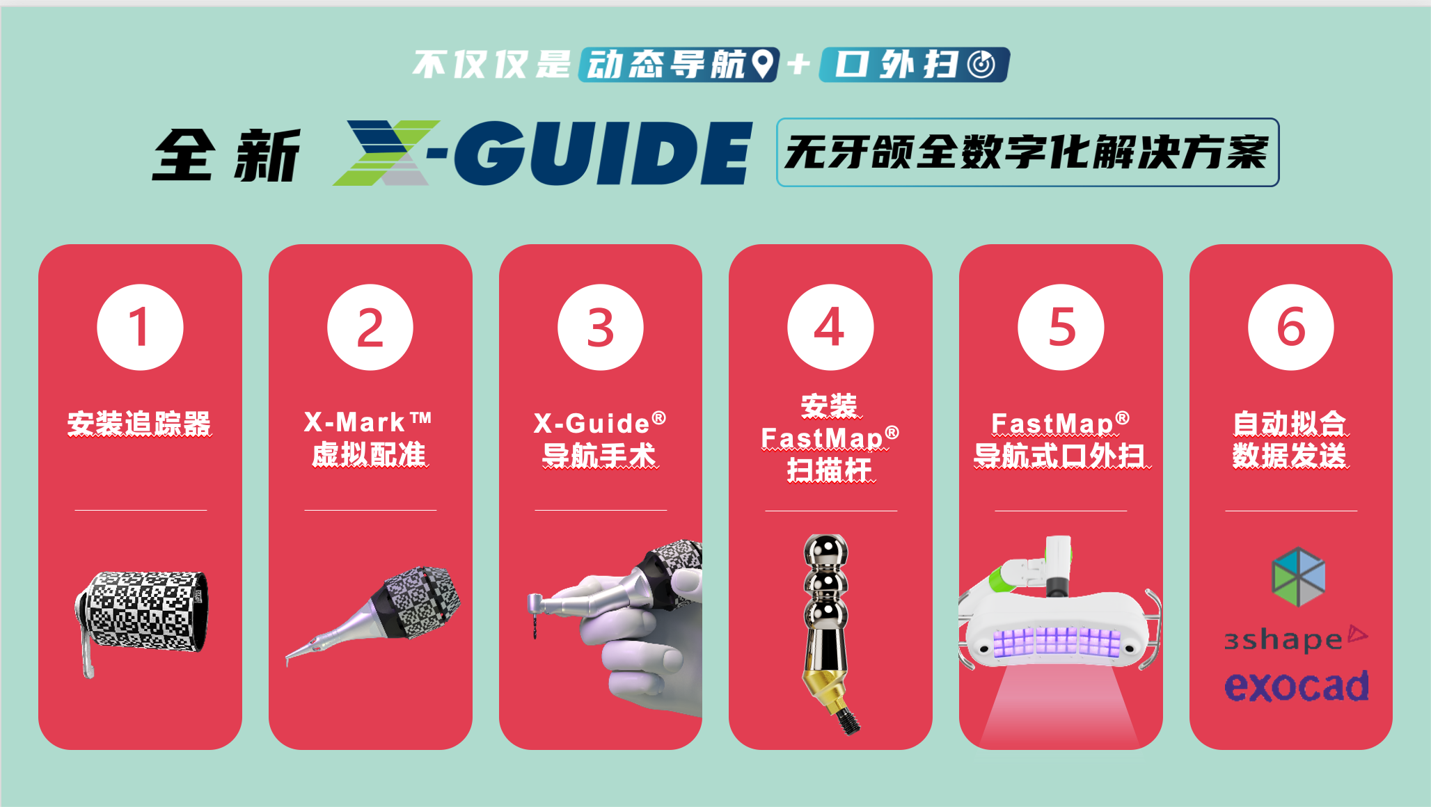 在无牙颌种植领域,X-Guide 动态导航系统凭借 X-Mark™ 虚拟配准技术和 FastMap 摄影测量功能,全新定义无牙颌数字化种植解决方案,实现极致的微创与效率,给患者更高的舒适度和满意度。