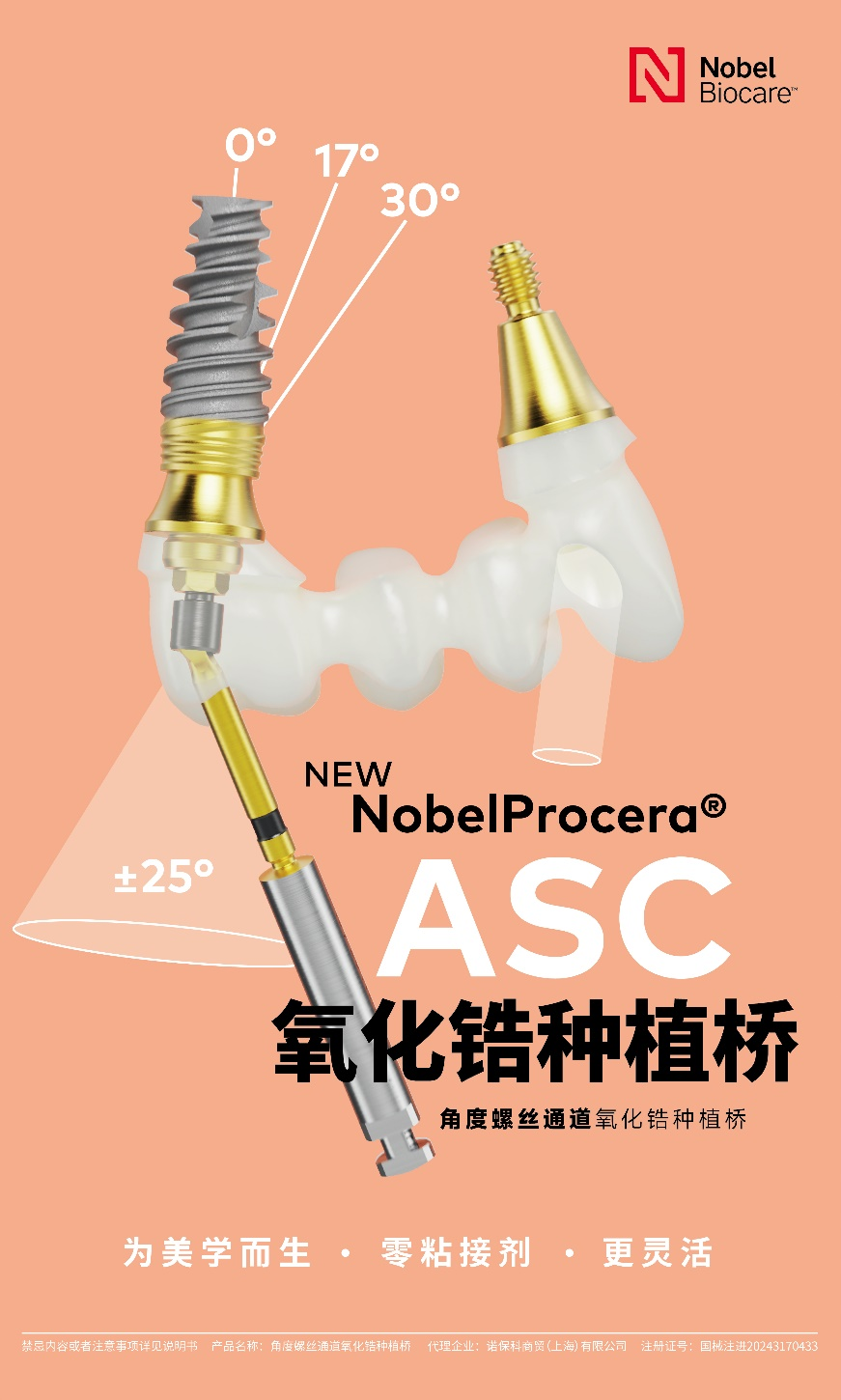 终修复阶段,新方案还搭配2025年全新登陆中国大陆的 NobelProcera ASC 无钛基零粘接全氧化锆种植桥,其独特结构允许螺丝通道与修复长轴形成0-25度夹角,纯螺丝固位摒弃粘接剂使用,为多牙及无牙颌修复提供更灵活的方案,兼顾修复功能性与美学效果,与X-Guide、FastMap形成技术闭环,实现从精准种植到高效修复的全流程数字化赋能。