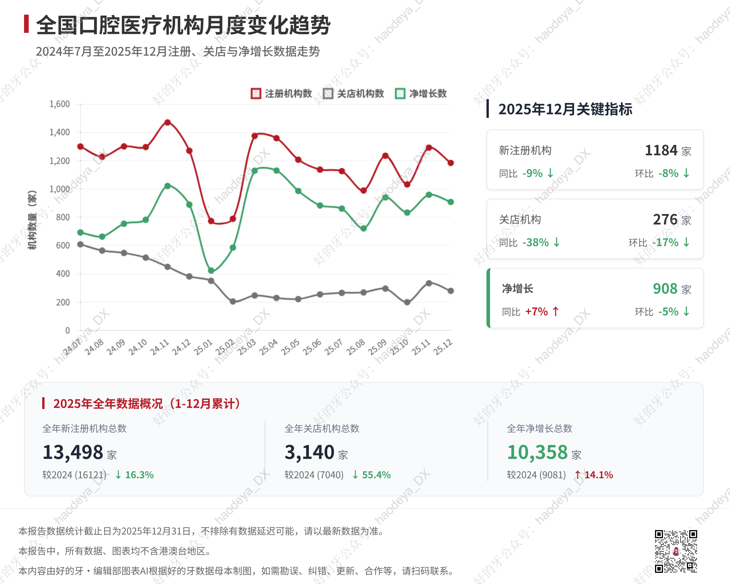 好的牙DataLab统计了截至2025年12月的数据:全年口腔医疗服务新注册13000家,比2024年下降了16%;全年总关店3000多家,比2024年下降了5%。